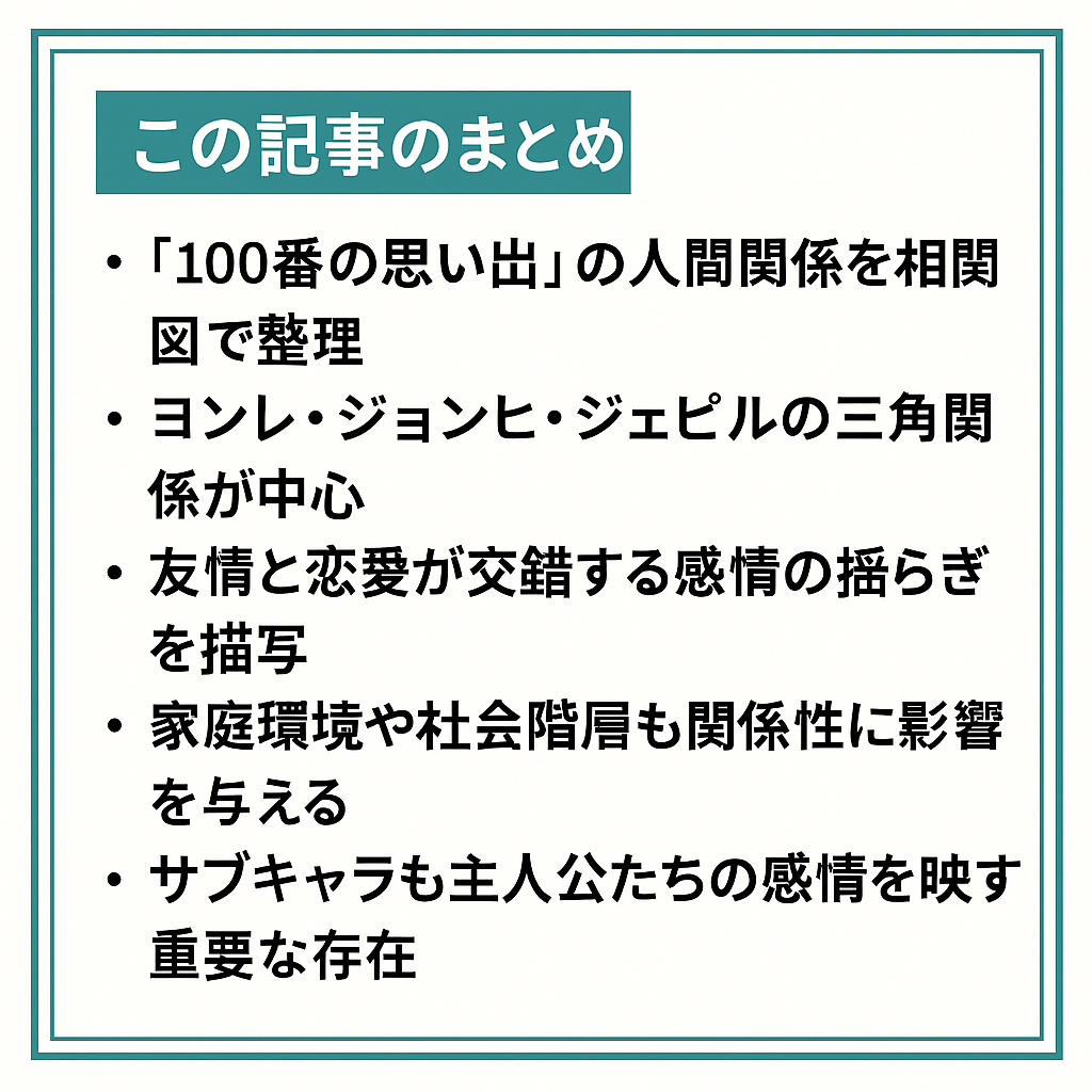 本記事で整理した相関図を参考に、登場人物たちの視線や言葉の裏にある感情の流れを読み解くことで、『100番の思い出』をより深く味わうことができるでしょう。